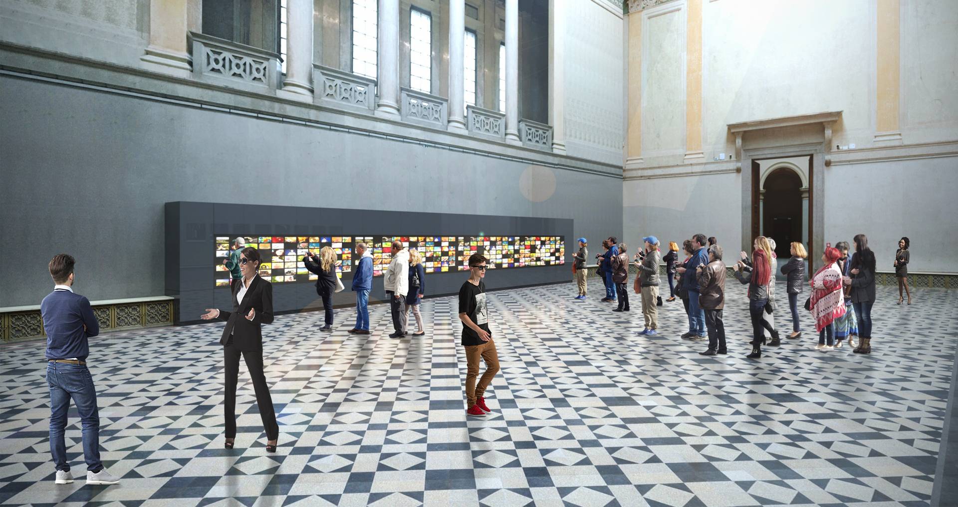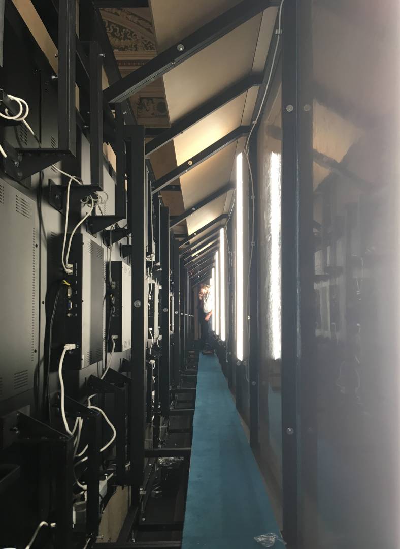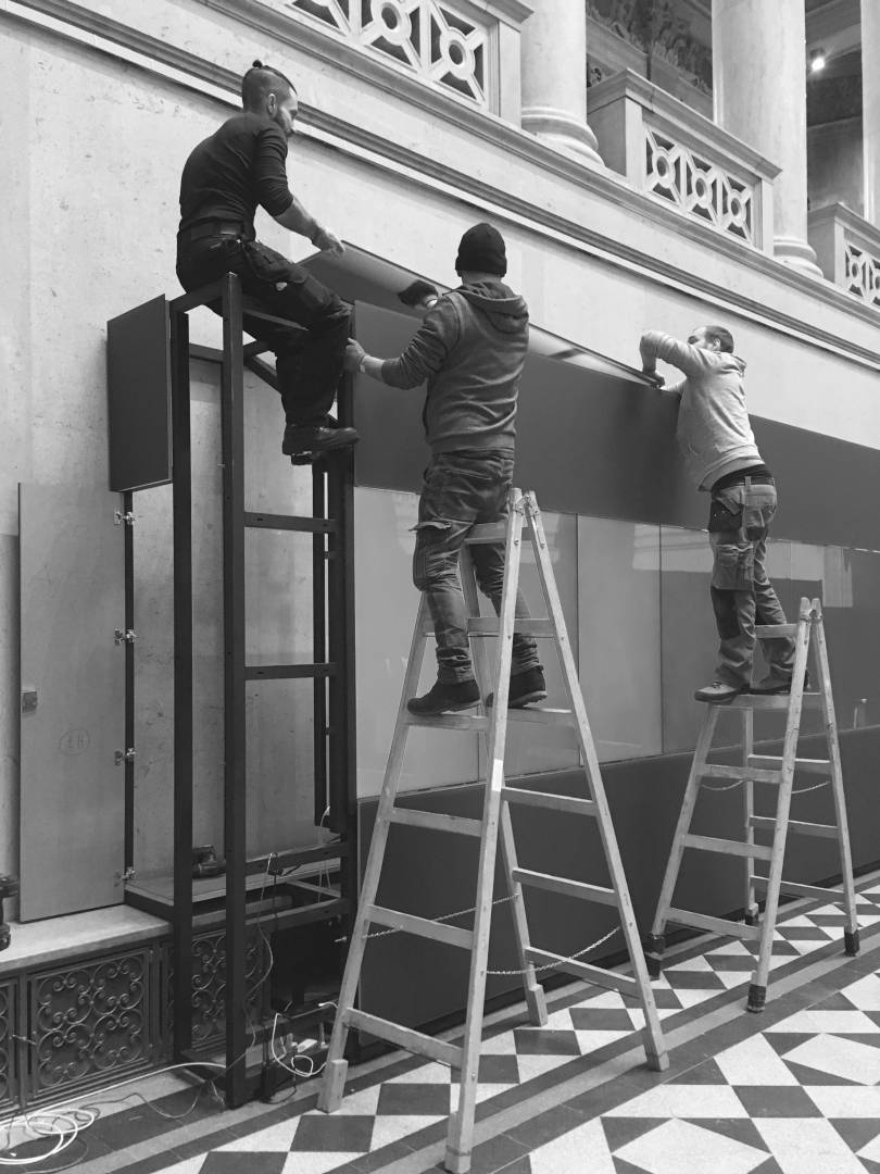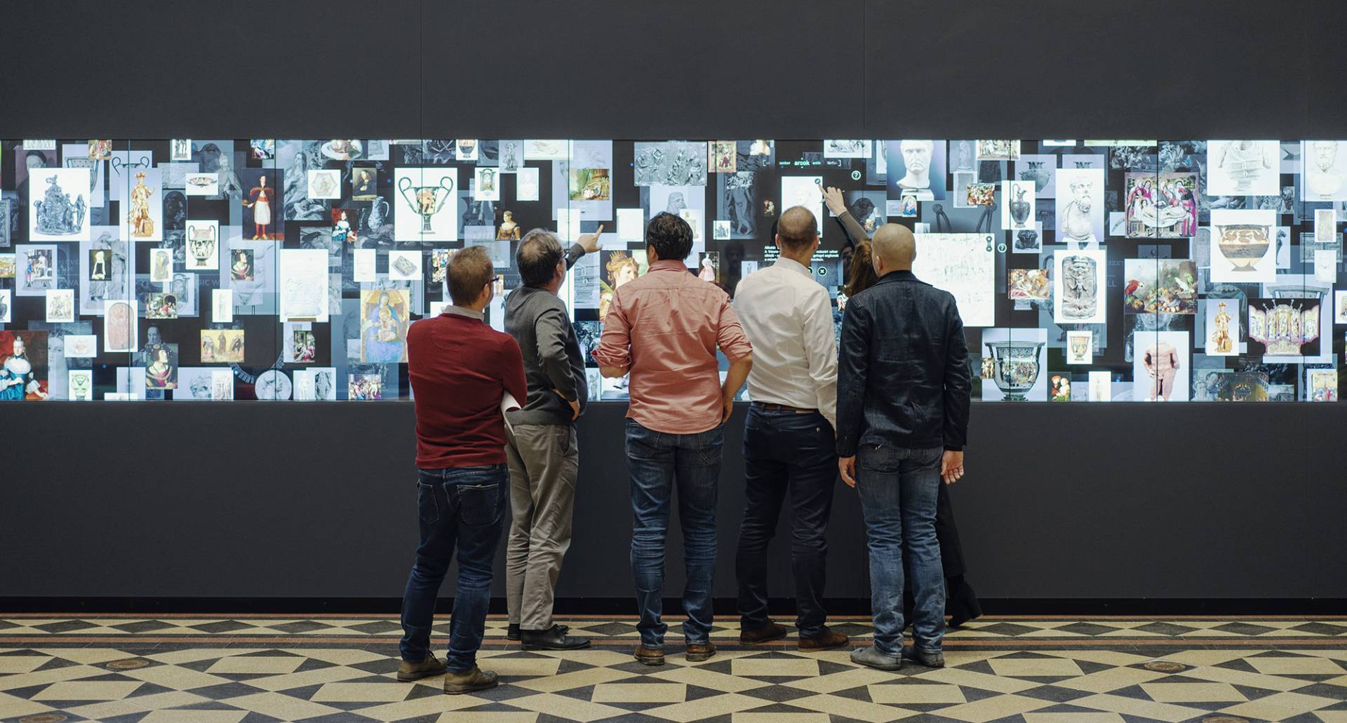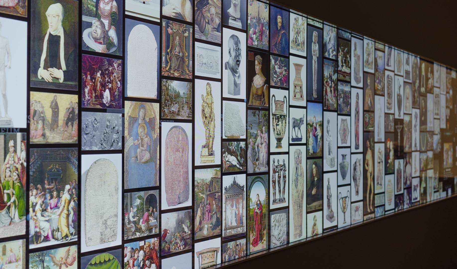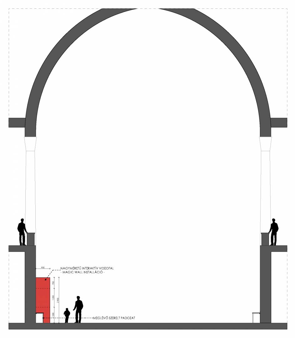 The 14-meter-long, 21-screen display designed for the Museum of Fine Arts is the world's largest Magic Wall structure. The large interactive wall has received a discreet appearance on request and this mentality can be traced to the placement, formatting and material use as well. The structure is located on the edge of the room, pushed against the wall. This position is useful for several reasons; electric power supply does not cause complications; it can be a stable structure in itself and easy access for visitors. Since it does not divide the room into two parts, it does not dominate the room so it can be used to host various events. Its dimensions were determined by considering the features of the room. Its width is the same as the width of the gallery above it and its height is the result of the convenient use of the displays and the optimization of the structure. As the possible interchangeability of the displays is also a relevant factor, the optimal width of the rear service passage is one of the most important aspects of the depth of the structure. Due to the protected environment, the biggest challenge was fixing against the overturning of the structure. The structure is fixed to the concrete underneath the floor without breaking or damaging the coverings and floor. The cover of the installation is dark grey matte glass, also chosen to avoid looking pretentious. Thanks to its full-surface gluing, it is a long-lasting, durable material and is not dangerous in case of breaking.