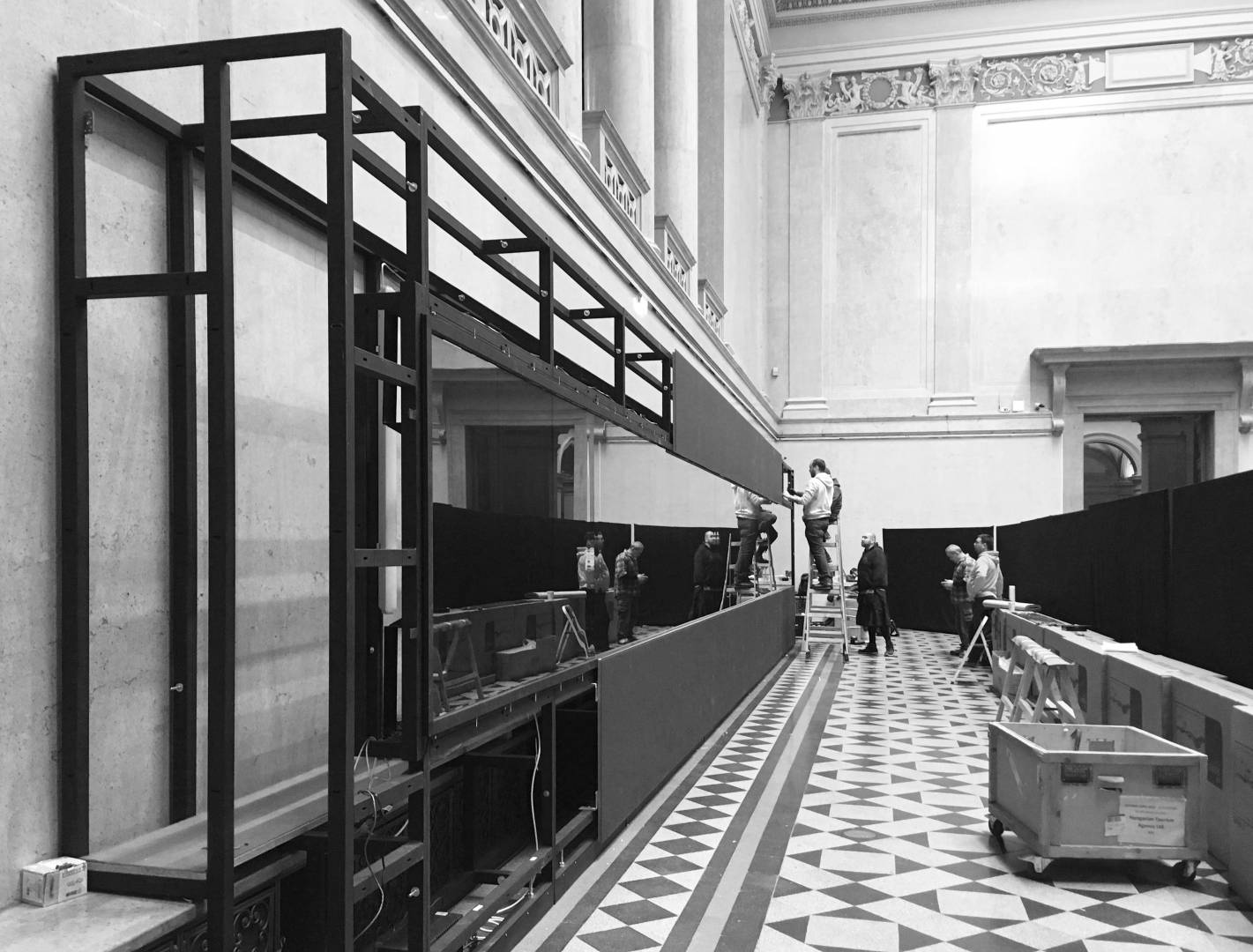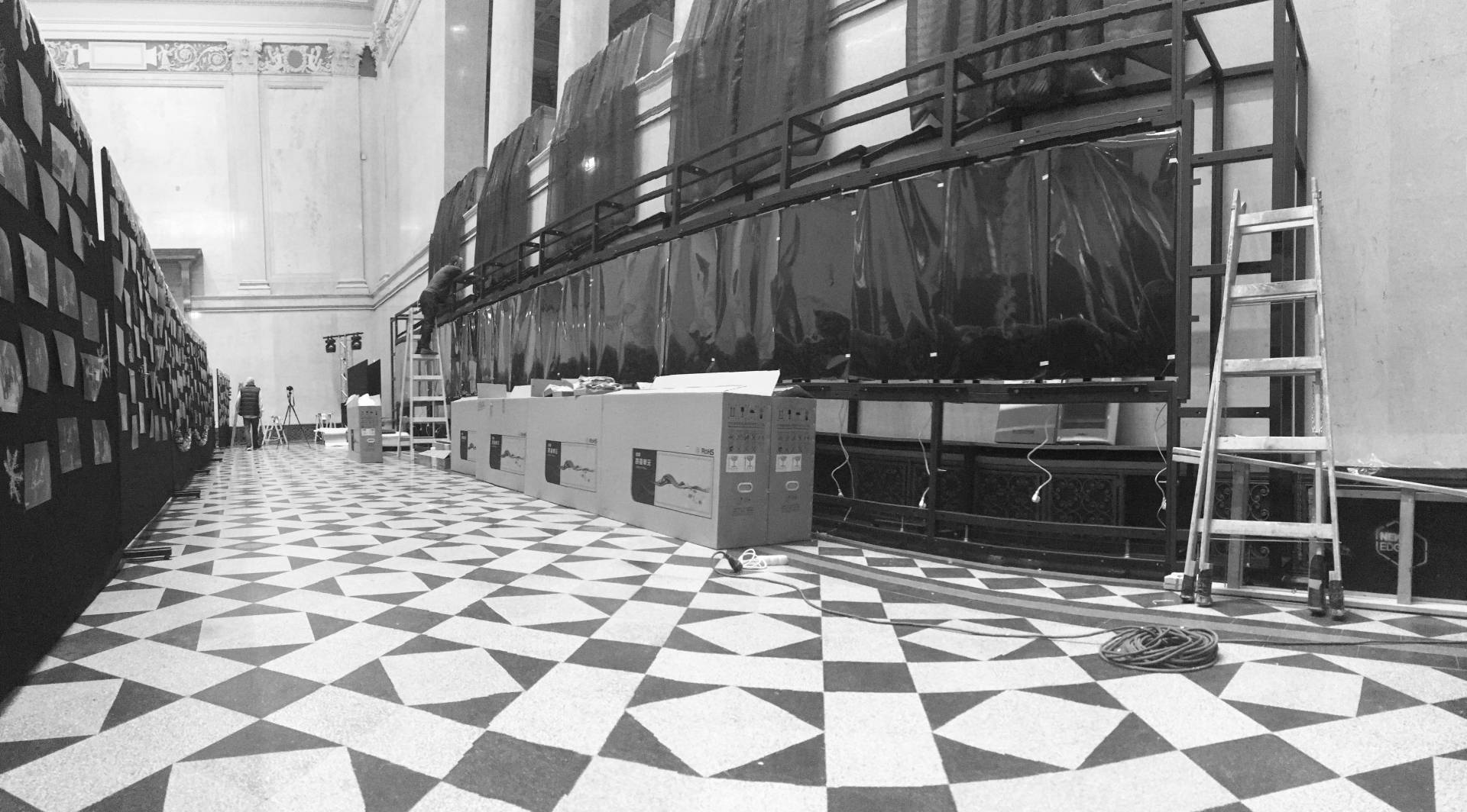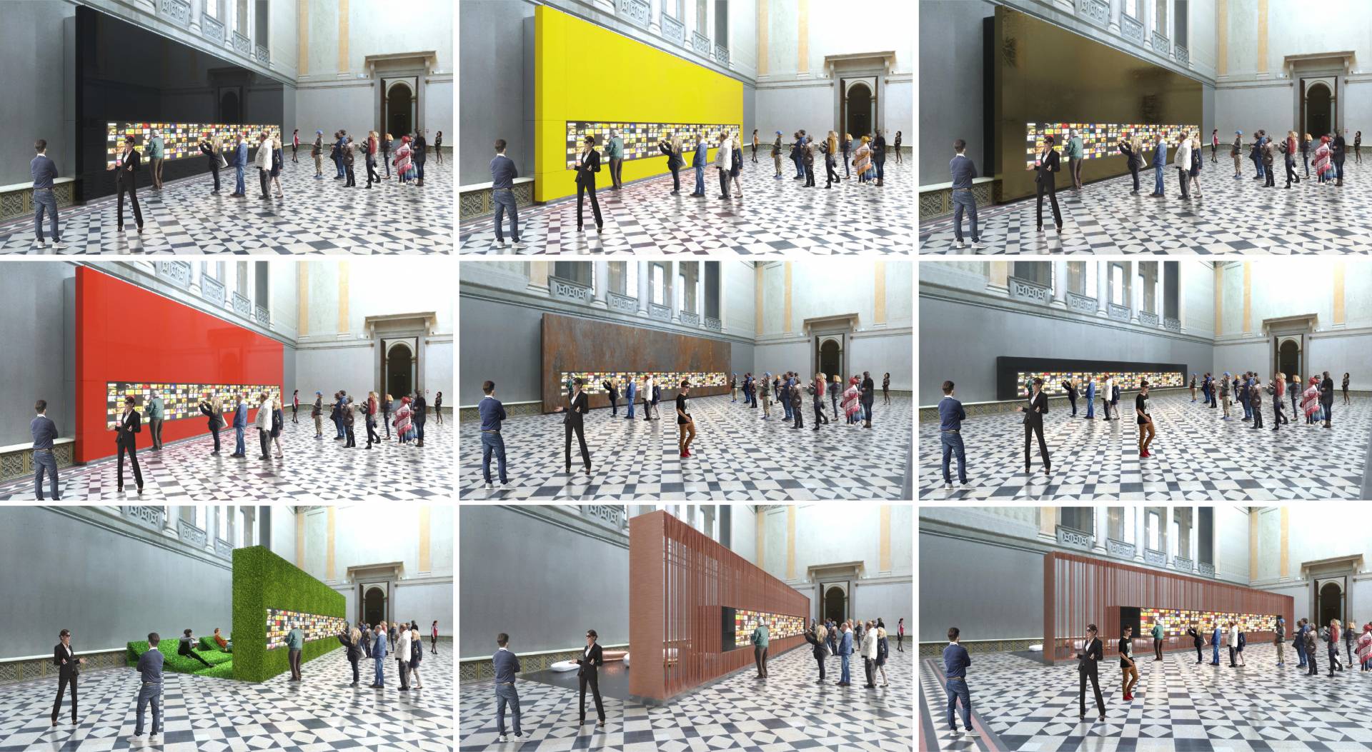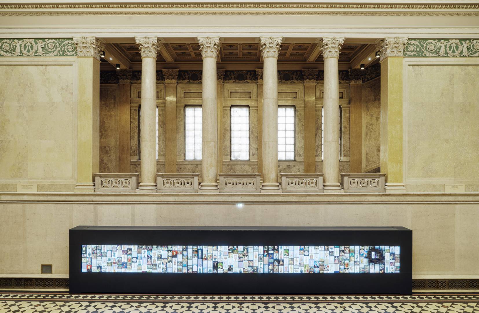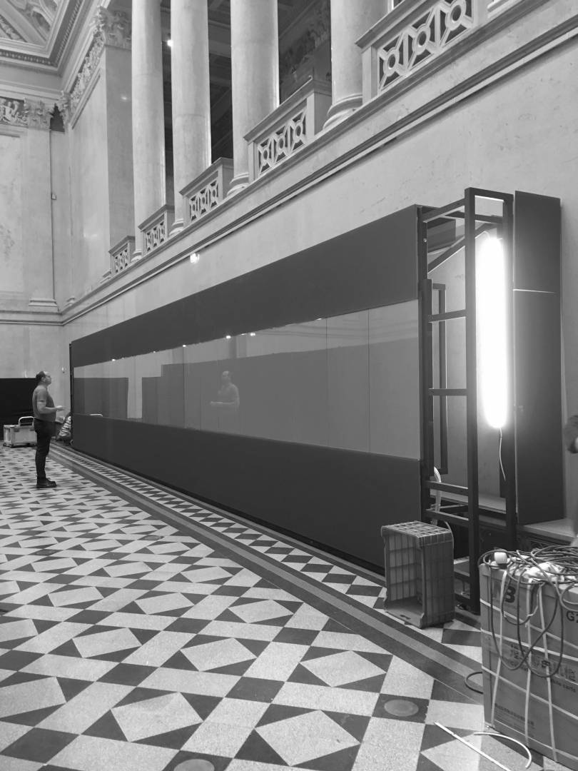 The 14-meter-long, 21-screen display designed for the Museum of Fine Arts is the world's largest Magic Wall structure. The large interactive wall has received a discreet appearance on request and this mentality can be traced to the placement, formatting and material use as well. The structure is located on the edge of the room, pushed against the wall. This position is useful for several reasons; electric power supply does not cause complications; it can be a stable structure in itself and easy access for visitors. Since it does not divide the room into two parts, it does not dominate the room so it can be used to host various events. Its dimensions were determined by considering the features of the room. Its width is the same as the width of the gallery above it and its height is the result of the convenient use of the displays and the optimization of the structure. As the possible interchangeability of the displays is also a relevant factor, the optimal width of the rear service passage is one of the most important aspects of the depth of the structure. Due to the protected environment, the biggest challenge was fixing against the overturning of the structure. The structure is fixed to the concrete underneath the floor without breaking or damaging the coverings and floor. The cover of the installation is dark grey matte glass, also chosen to avoid looking pretentious. Thanks to its full-surface gluing, it is a long-lasting, durable material and is not dangerous in case of breaking.
