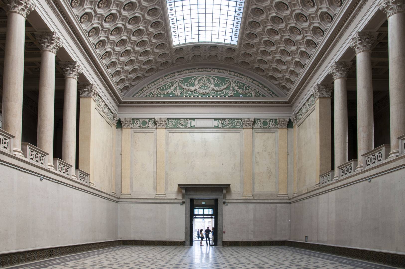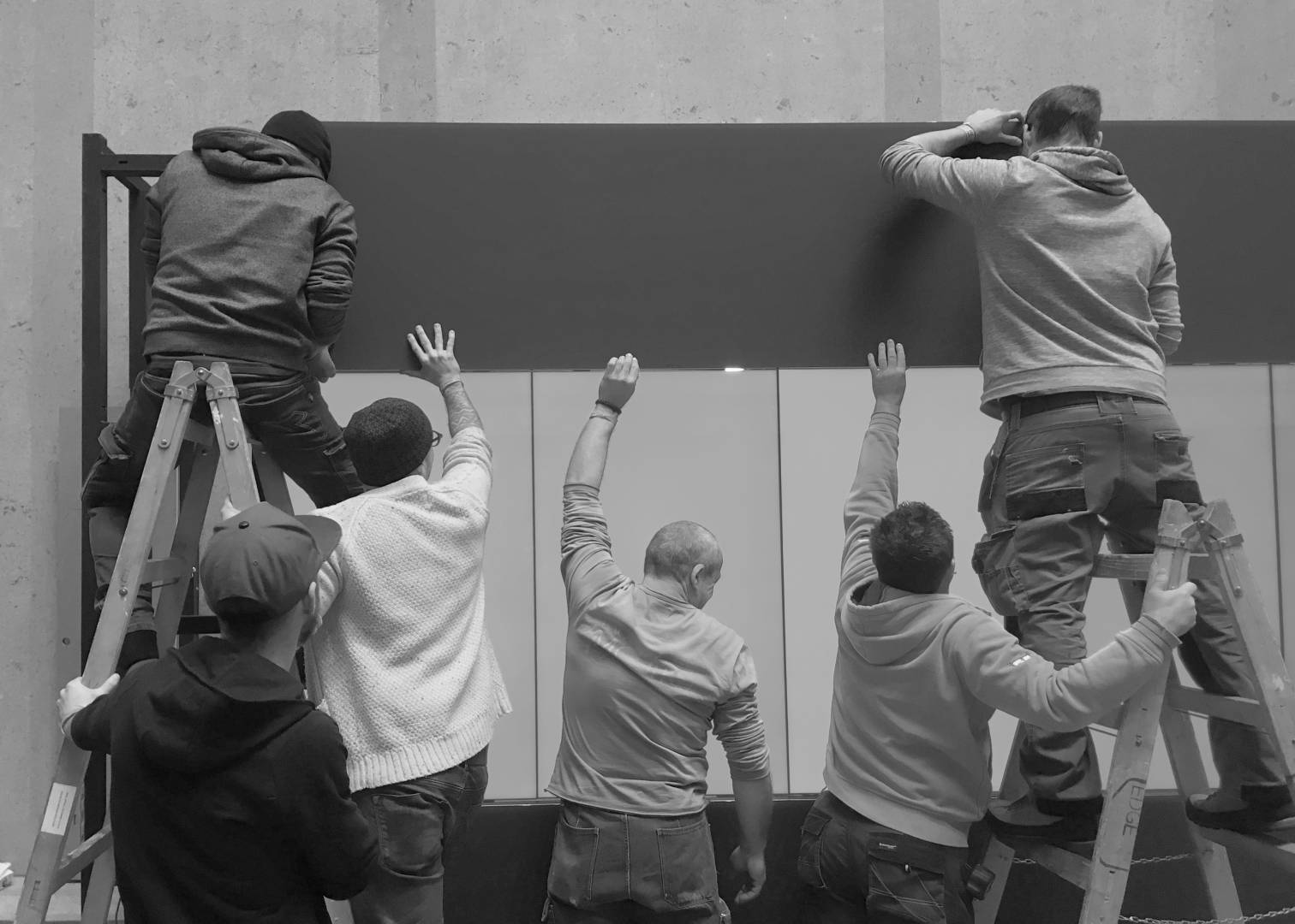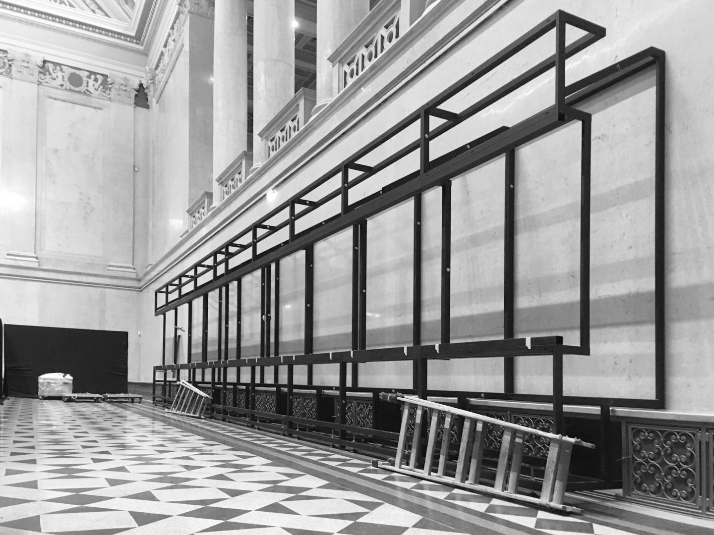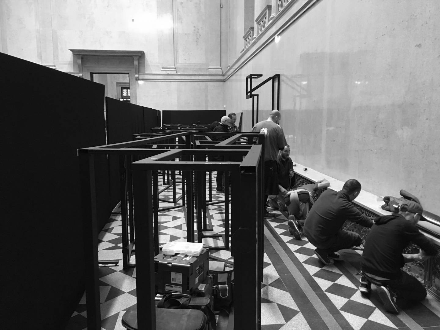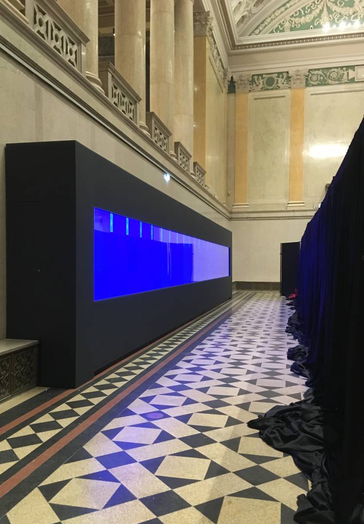The 14-meter-long, 21-screen display designed for the Museum of Fine Arts is the world's largest Magic Wall structure. The large interactive wall has received a discreet appearance on request and this mentality can be traced to the placement, formatting and material use as well. The structure is located on the edge of the room, pushed against the wall. This position is useful for several reasons; electric power supply does not cause complications; it can be a stable structure in itself and easy access for visitors. Since it does not divide the room into two parts, it does not dominate the room so it can be used to host various events. Its dimensions were determined by considering the features of the room. Its width is the same as the width of the gallery above it and its height is the result of the convenient use of the displays and the optimization of the structure. As the possible interchangeability of the displays is also a relevant factor, the optimal width of the rear service passage is one of the most important aspects of the depth of the structure. Due to the protected environment, the biggest challenge was fixing against the overturning of the structure. The structure is fixed to the concrete underneath the floor without breaking or damaging the coverings and floor. The cover of the installation is dark grey matte glass, also chosen to avoid looking pretentious. Thanks to its full-surface gluing, it is a long-lasting, durable material and is not dangerous in case of breaking.