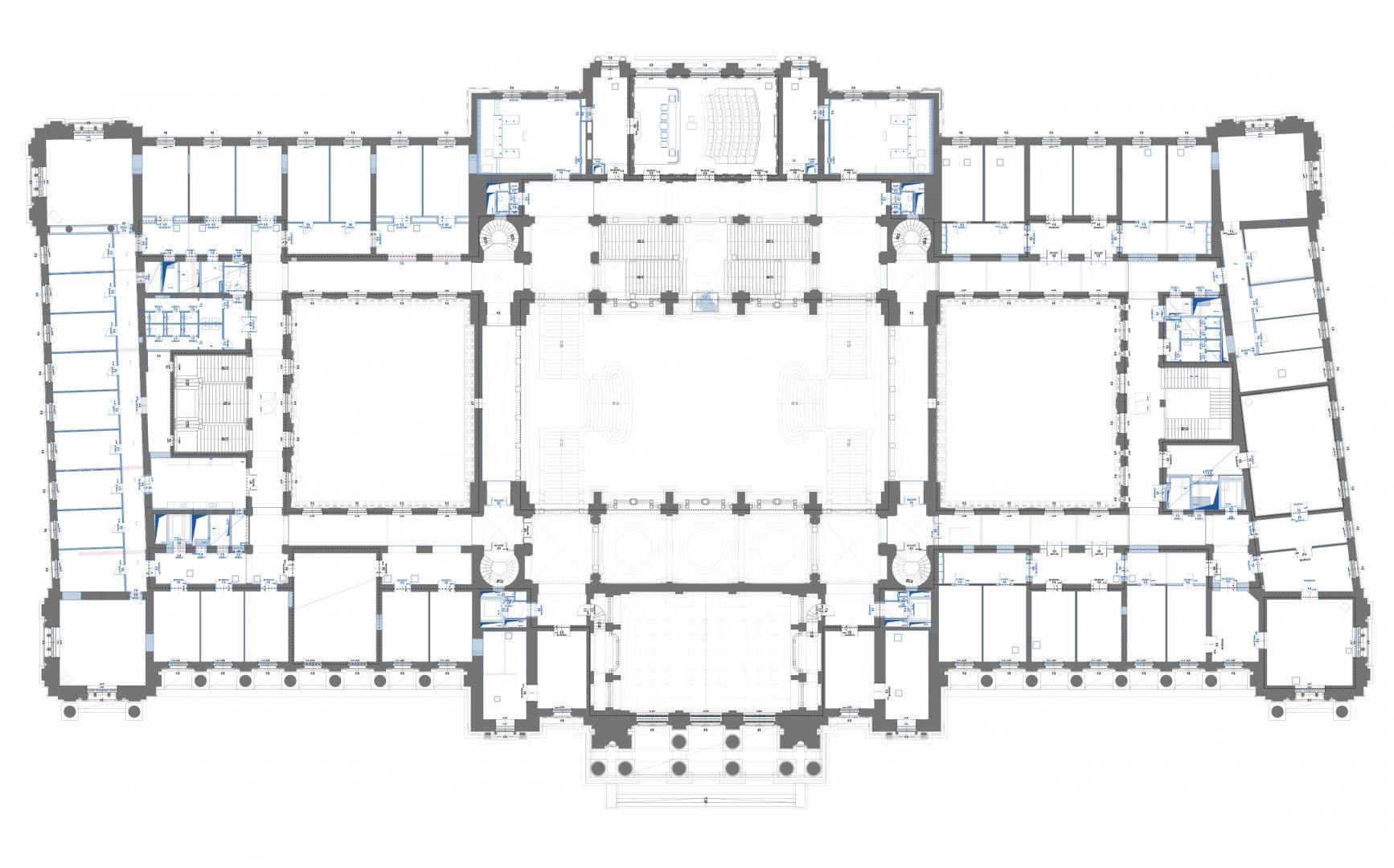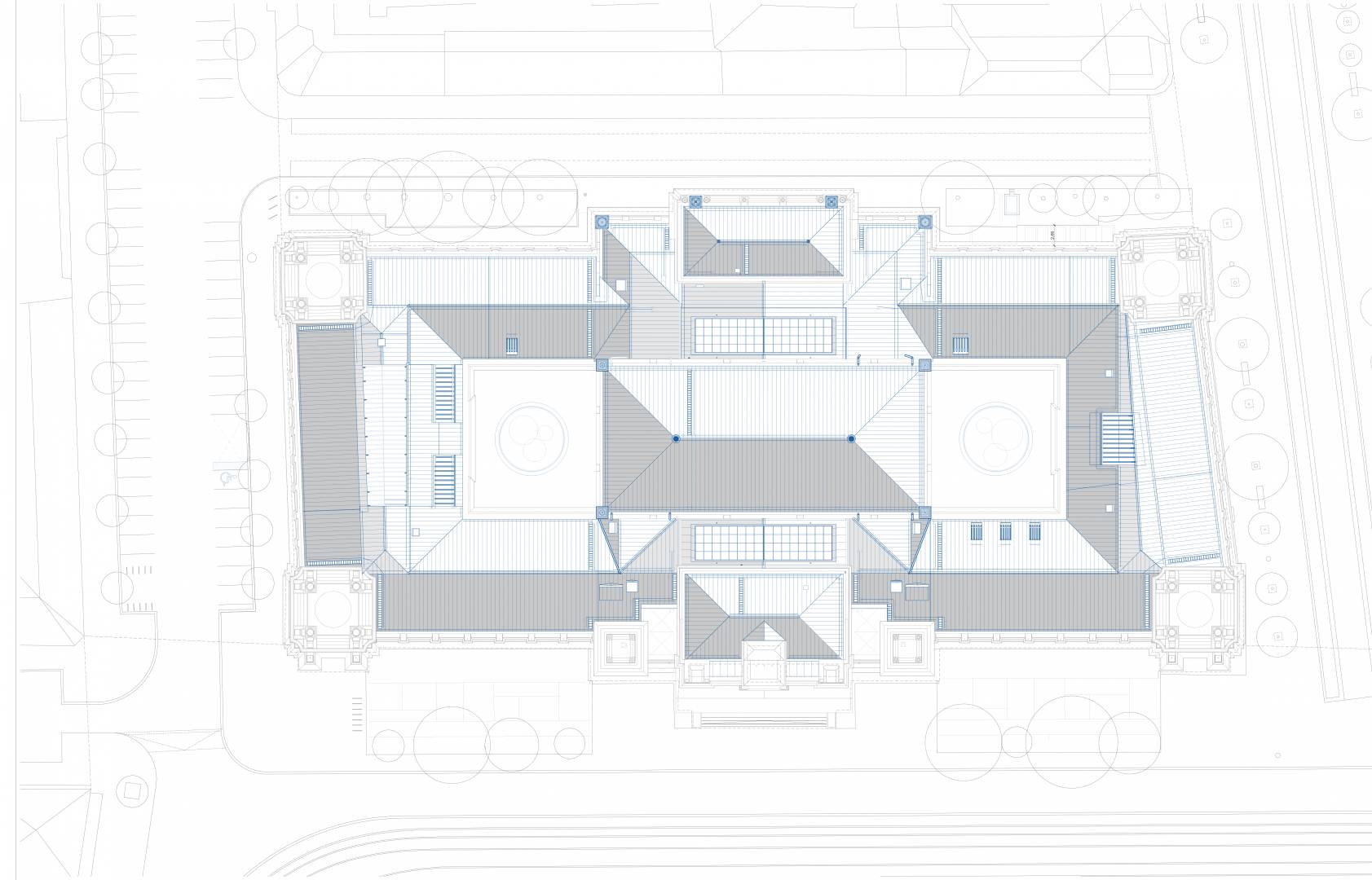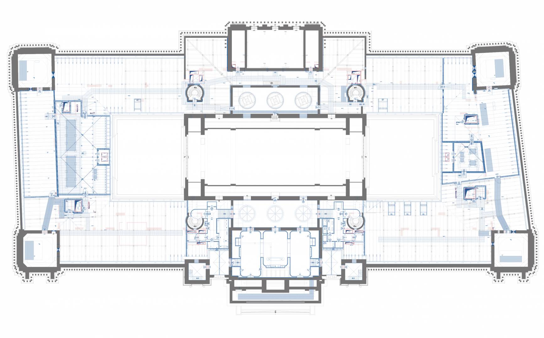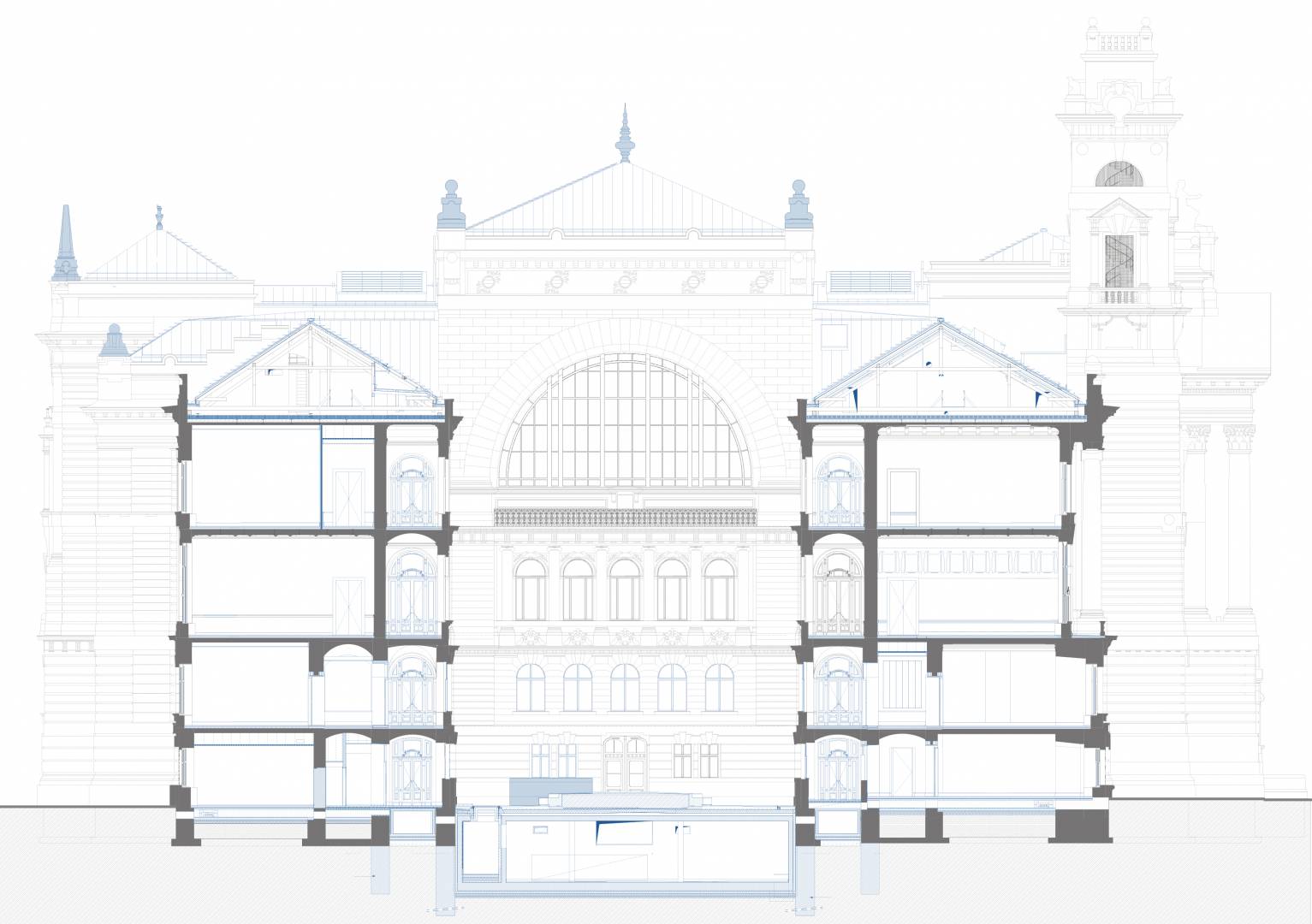 The purpose of the project is to restore the original function and light of the Palace of Justice by protecting, restoring and reconstructing the historical values of the protected building, taking into account the needs of today and the changes in the function. The way to do this is the removal of the subsequent additions, the partial installation of the attic, the one-level substructure of the courtyards, the construction of a transformer basement level, the placement of four new elevators, and the creation of a court function.