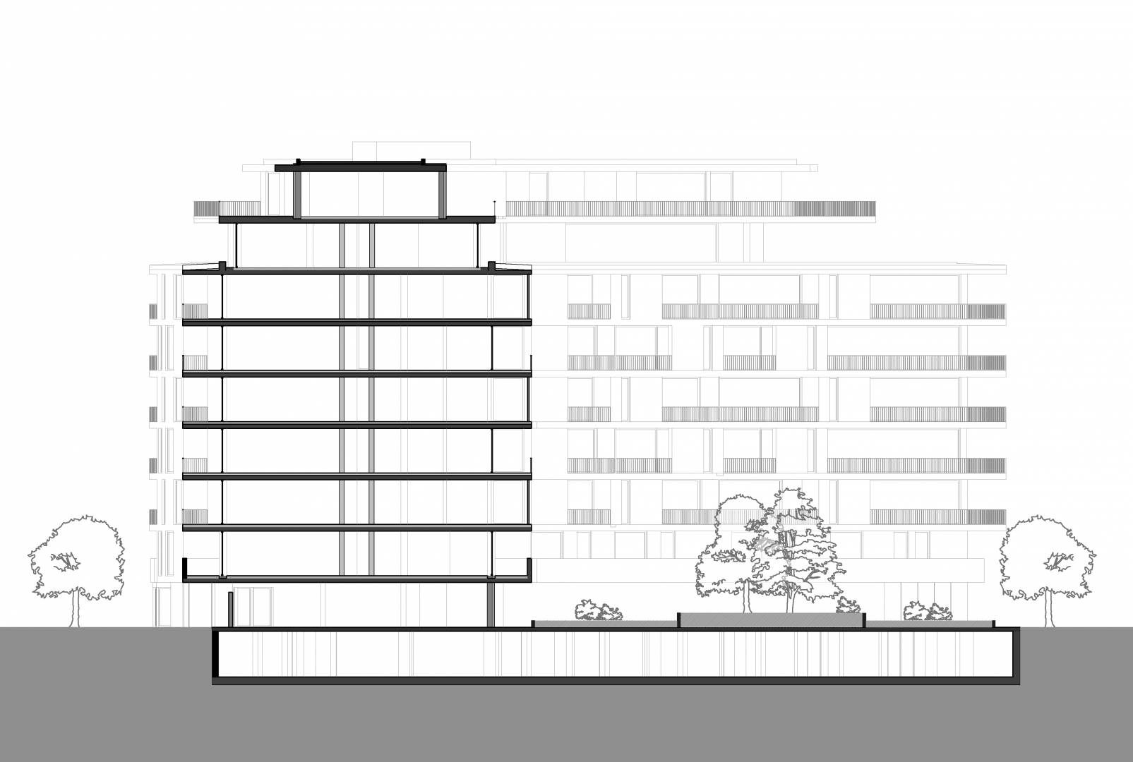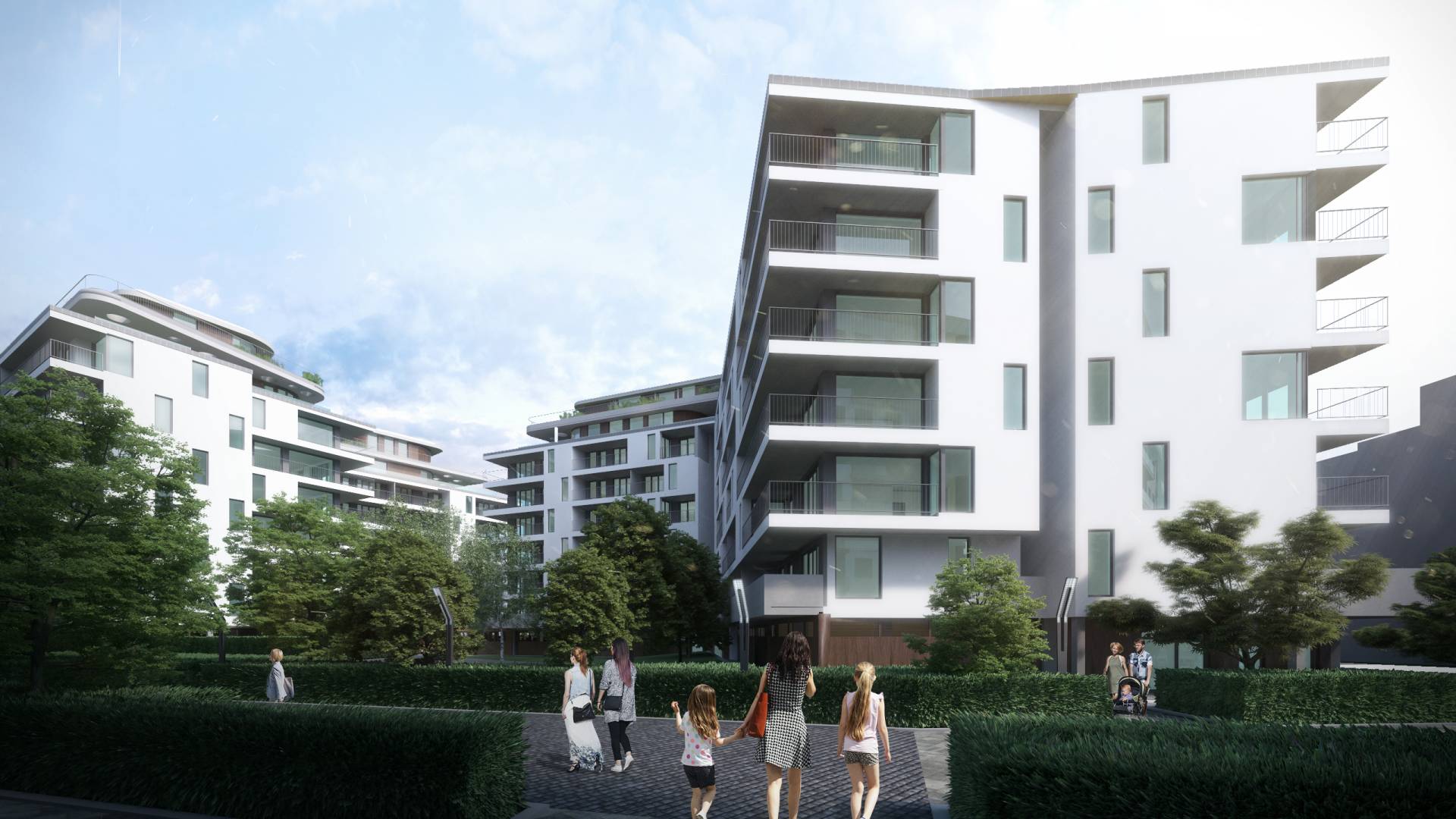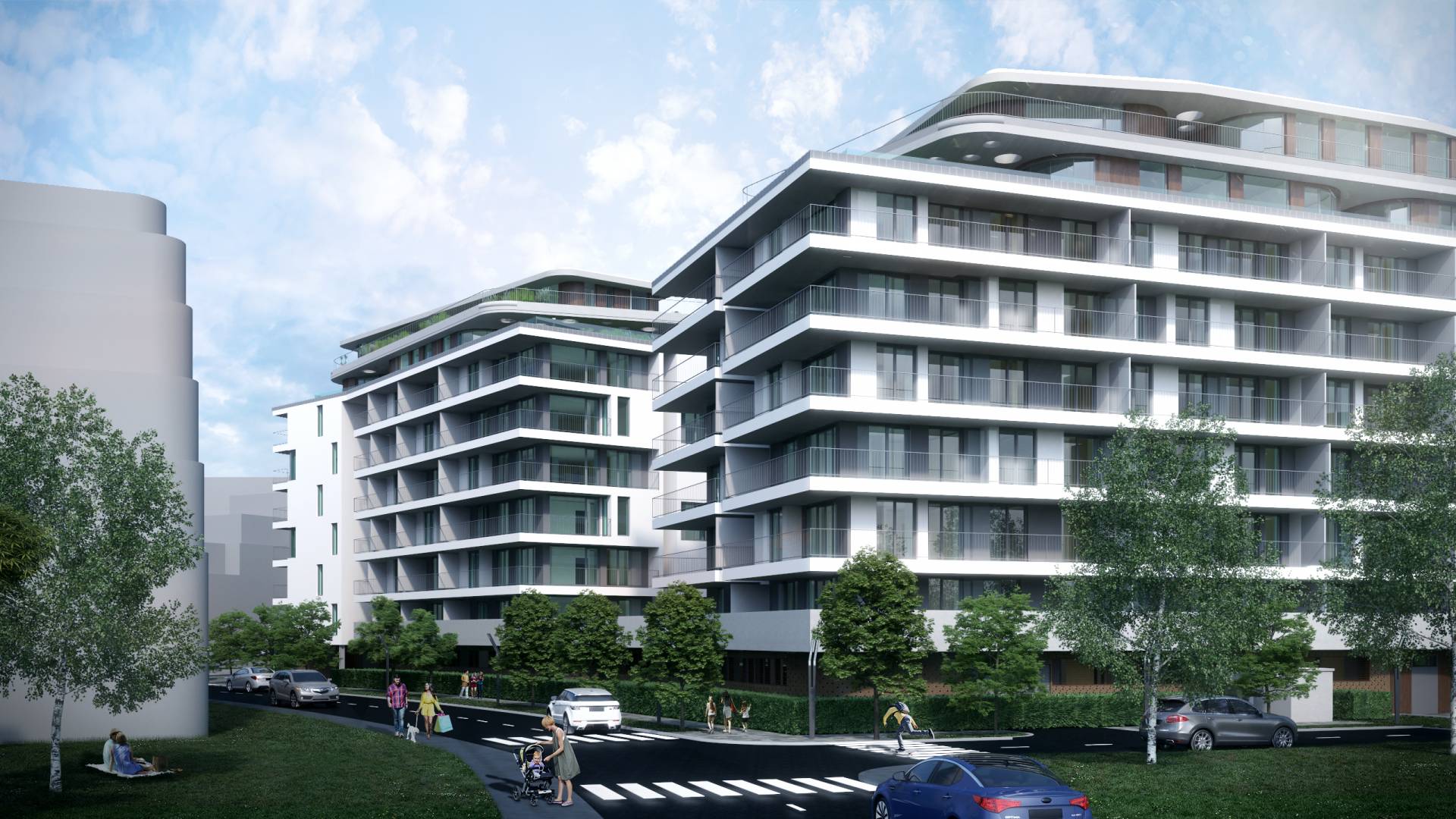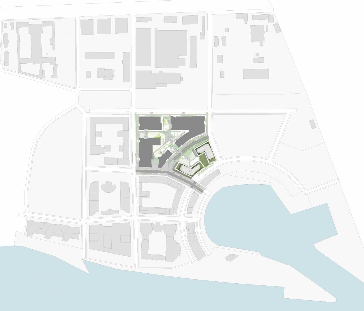 A pince + földszint + 8 emeletes társasház beépítési koncepciója a szomszédos telken épülő társasházéval együtt, azzal összhangban készült. A kb. 200 lakást magába foglaló tömb térszint alatt és a földszinten összefogott két „L” alaprajzú épületszárnya úgy alkot közös kompozíciót, hogy nagy, humánus méretű egységekre bomlik, értékelhető átlátásokat enged az öböl felé nemcsak a hátsó szárnyból, hanem a szomszédos tömb felől is. A beépítés nagy és levegős épületközöket enged az épülettestek között és jó arányú zöld parkokat ölel körül két térszinten is.  A földszint és a két visszaléptetett felső szint organikus tömegformálása oldja aközépső homlokzati mezők szigorúbb architektúráját.  A ZED Stúdió a koncepcióterv kidolgozásától vesz részt a tervezésben.