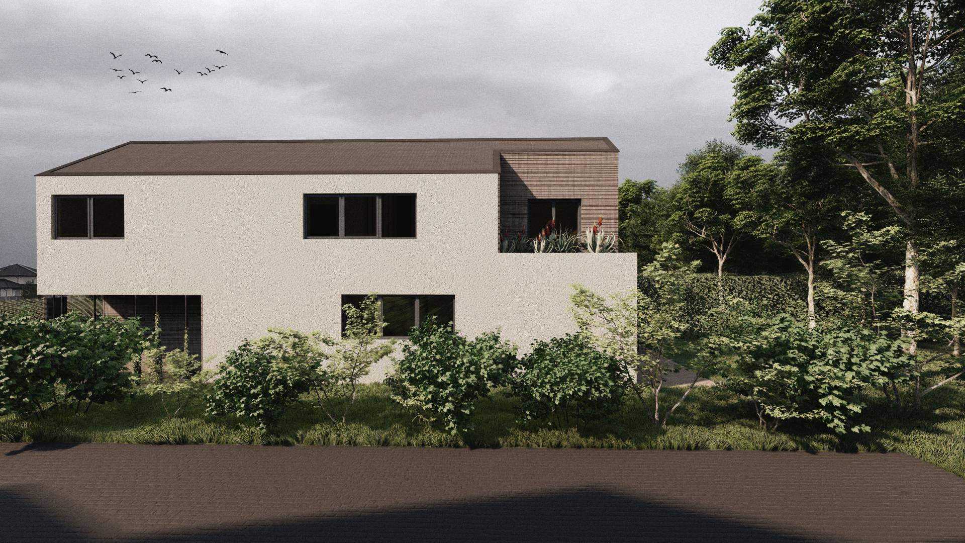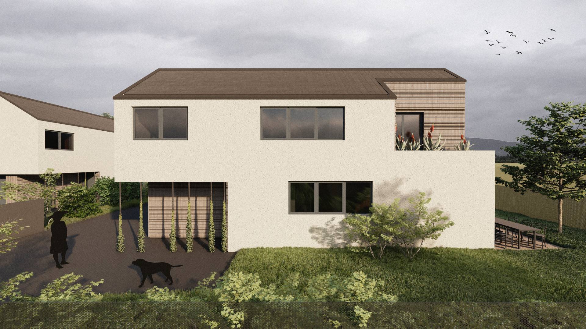 Az épület tömege visszafogott, kubusszerű, a településképi illeszkedéshez szükséges szempontokat szem előtt tartva, de mégis kicsit új szemlélettel alakítva a környéken megszokott 3-4 lakásos társasházi tömböt.