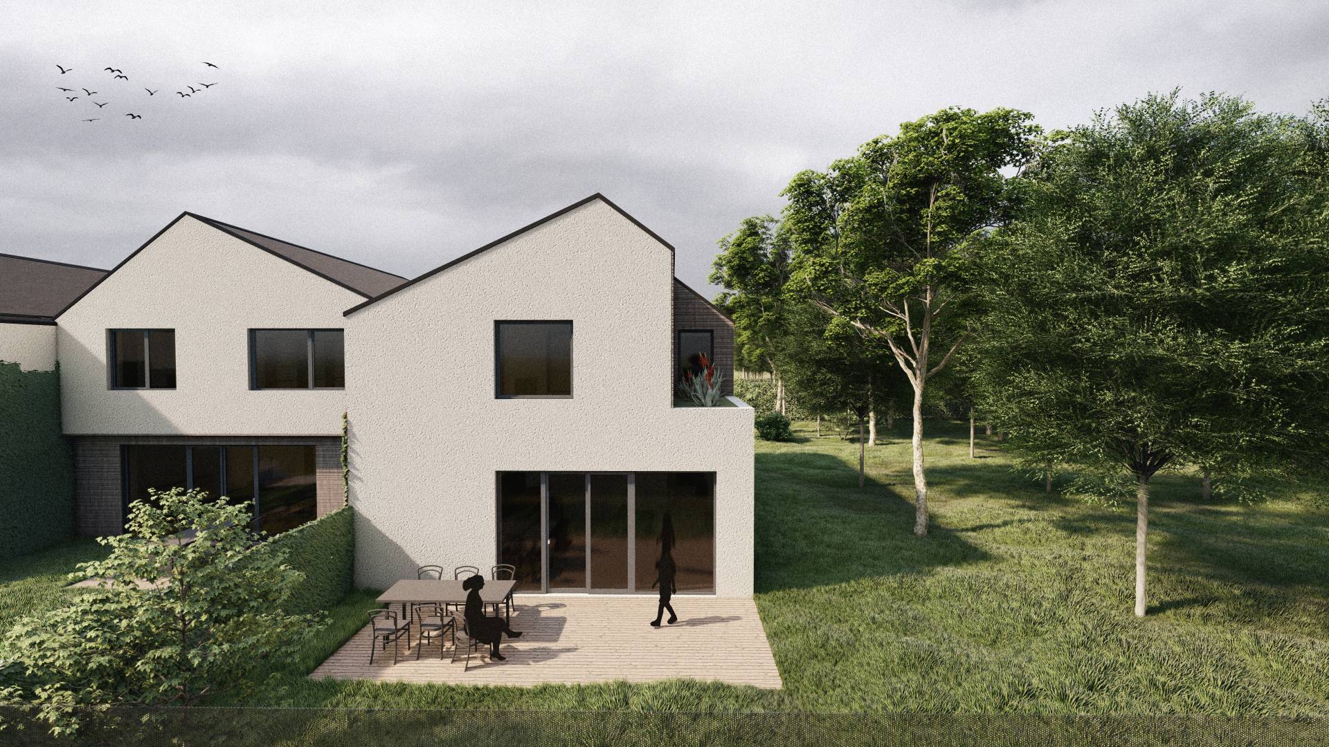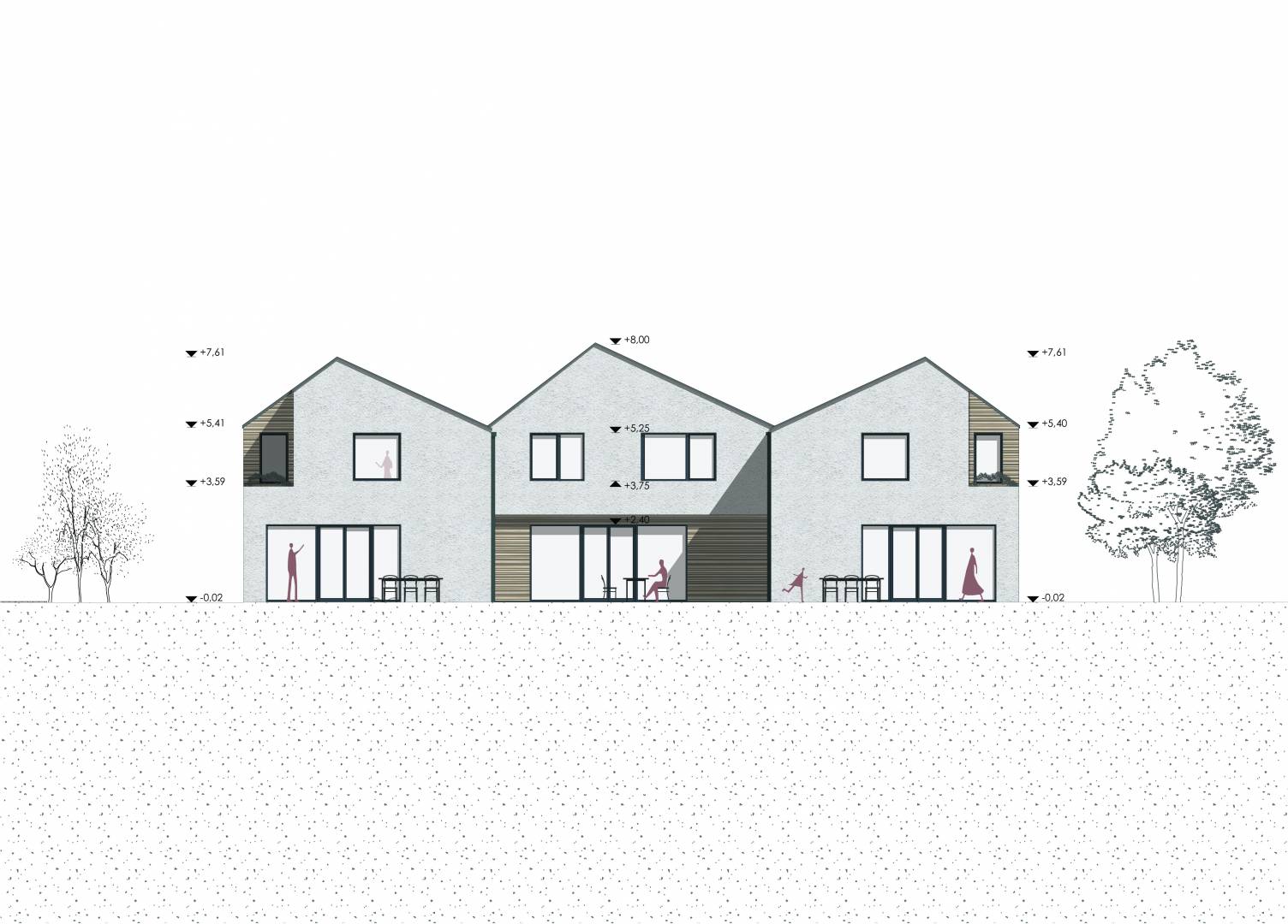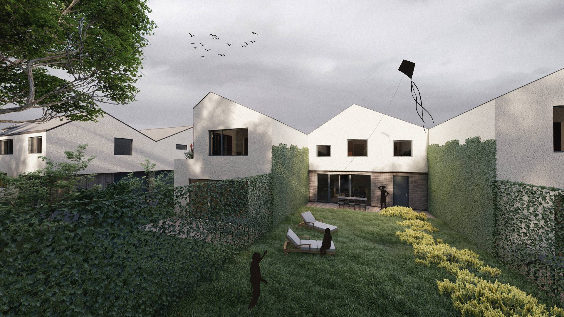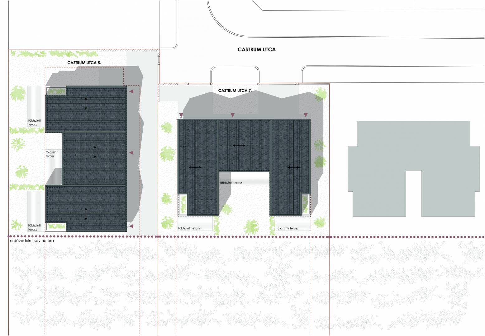 A beépítésnél fő szempont volt a minél privátabb hátsó kertrészek kialakítása, így egy U alakú tömb született, aminek köszönhetően a középső, visszahúzott lakásnak is megfelelő méretű saját kertje lehet.