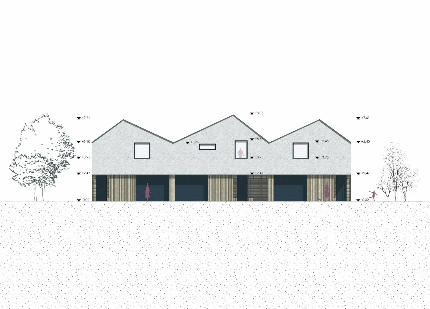 Magastetős, oromfalas. A tető a tömegalakítás egyik legmeghatározóbb eleme, a játékos formálás egyben lehetőséget ad arra, hogy a három külön rendeltetési egységet egyértelműen kijelölje, és egy egyszerű eszközzel egyéni karaktert adjon nekik.