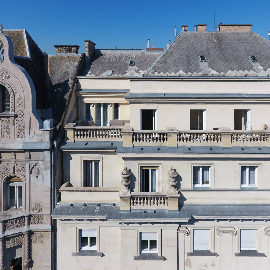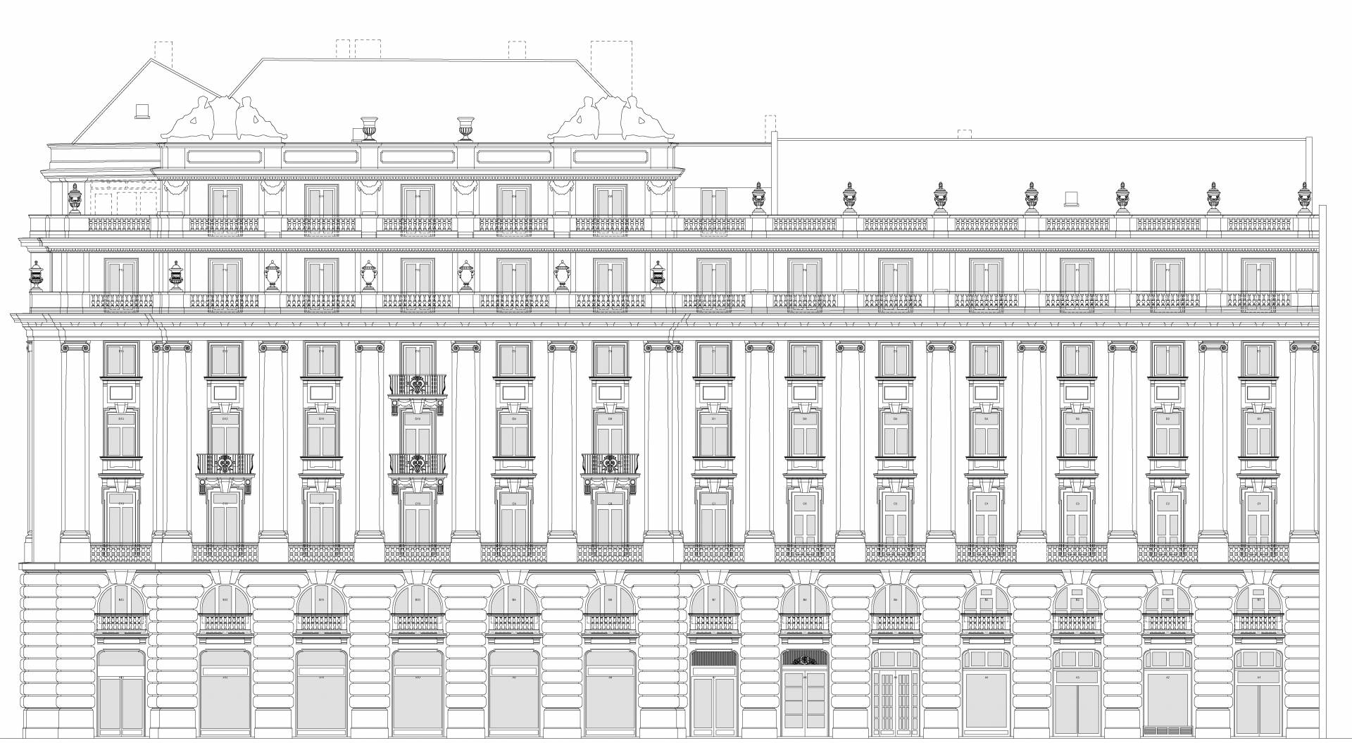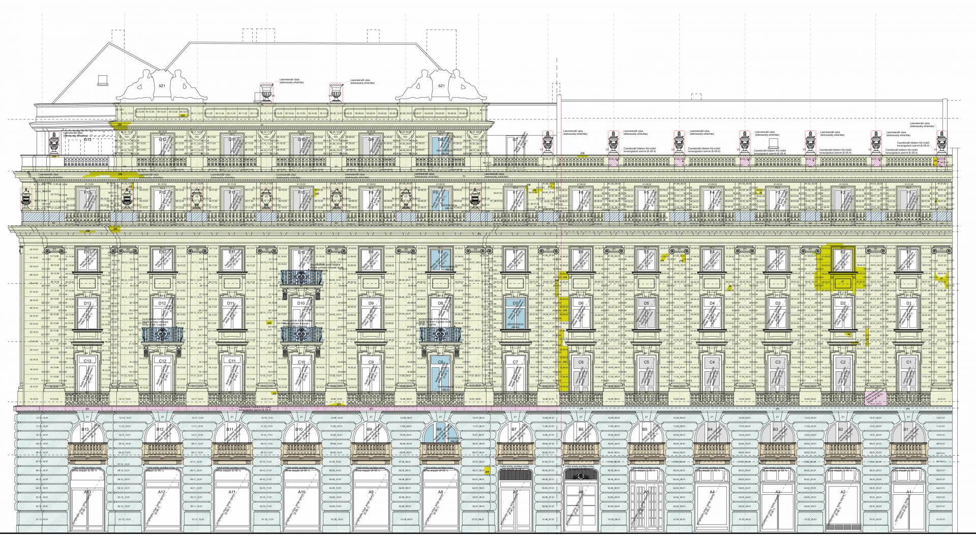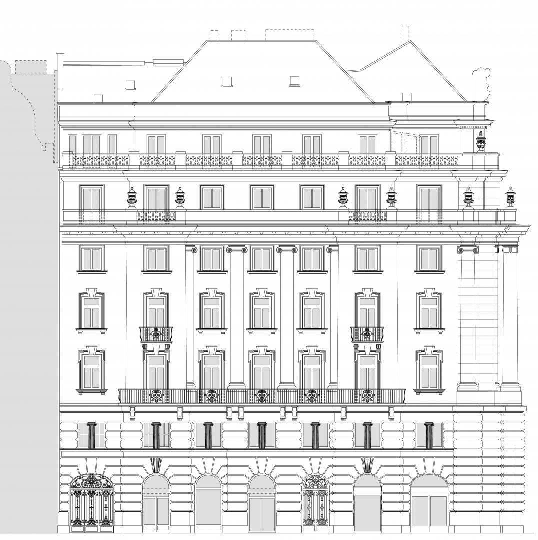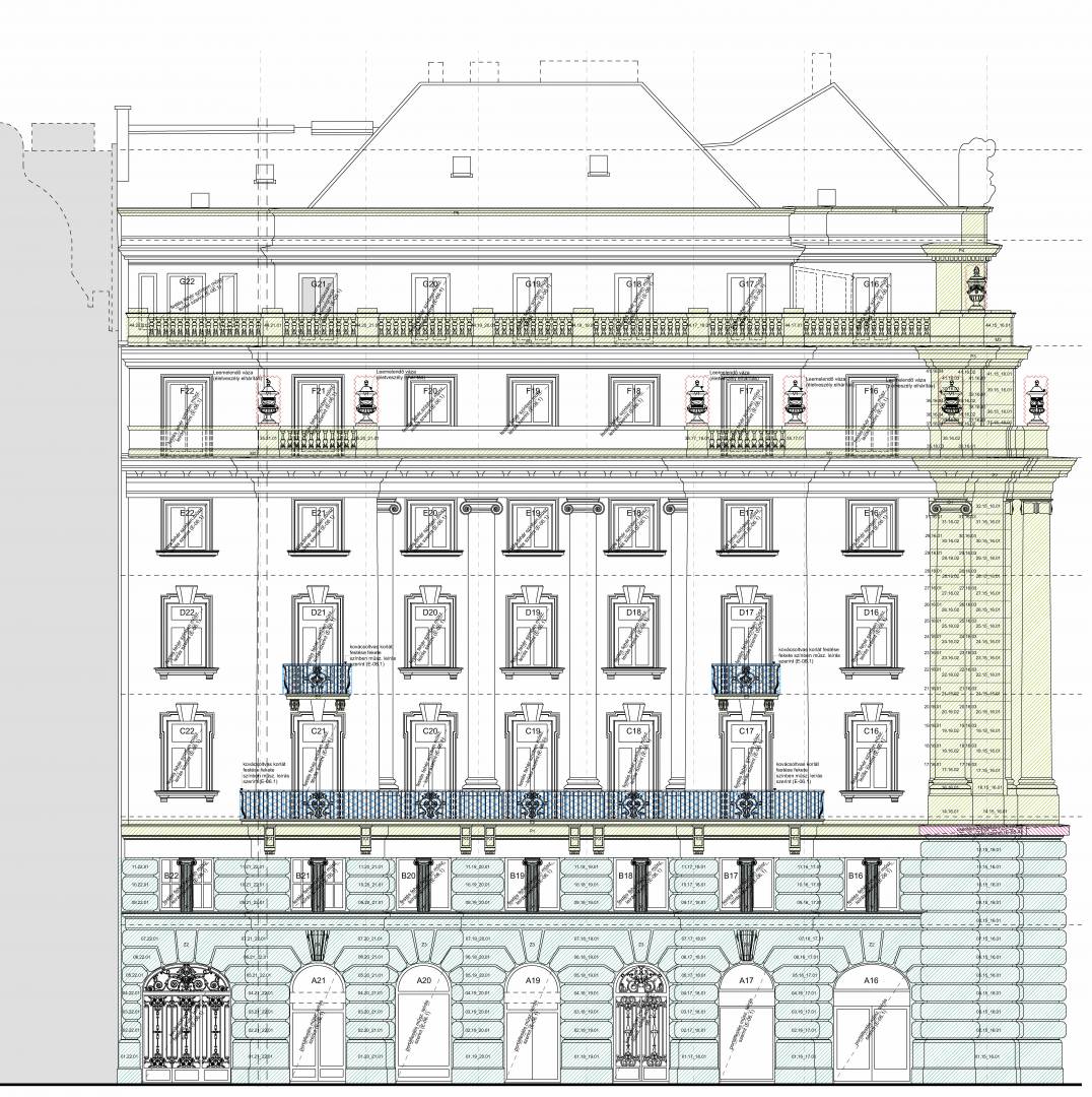 A megbízás célja, hogy a Kossuth tér déli térfalát alkotó 6-10. számok alatti épületegyüttes homlokzata egységes képet mutasson, műszakilag jó minőségű, esztétikailag kifogástalan homlokzatok jöjjenek létre. A 9-10. szám alatti két épület valójában eltérő időben és szerkezettel, technológiákkal épült ház, amelyet egységes homlokzata köt össze.