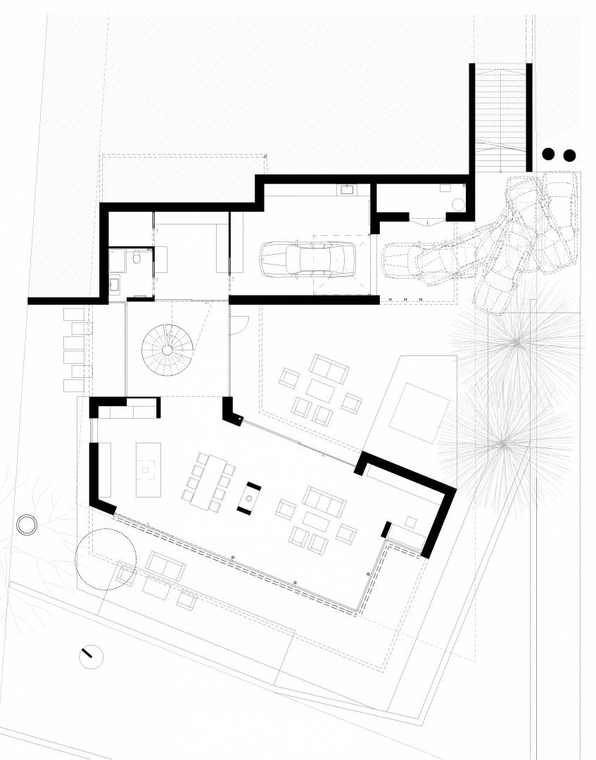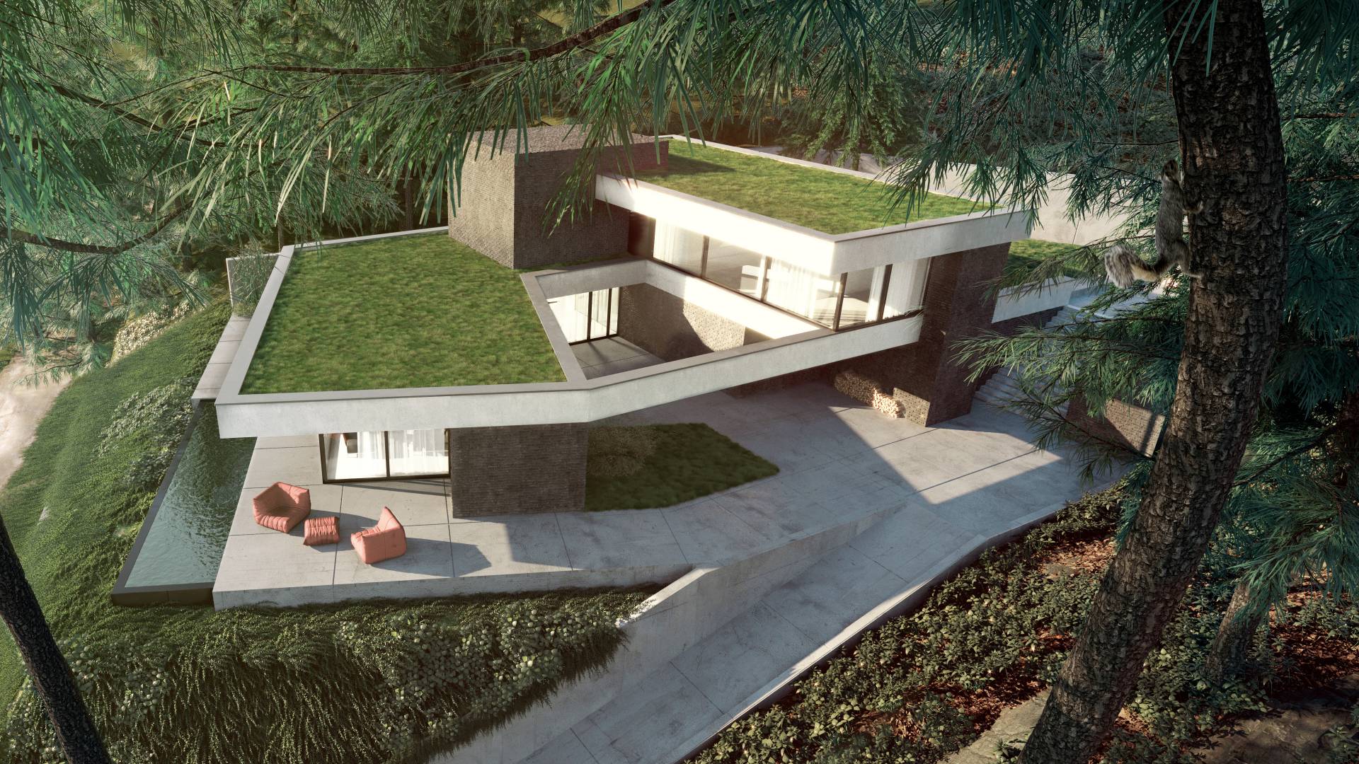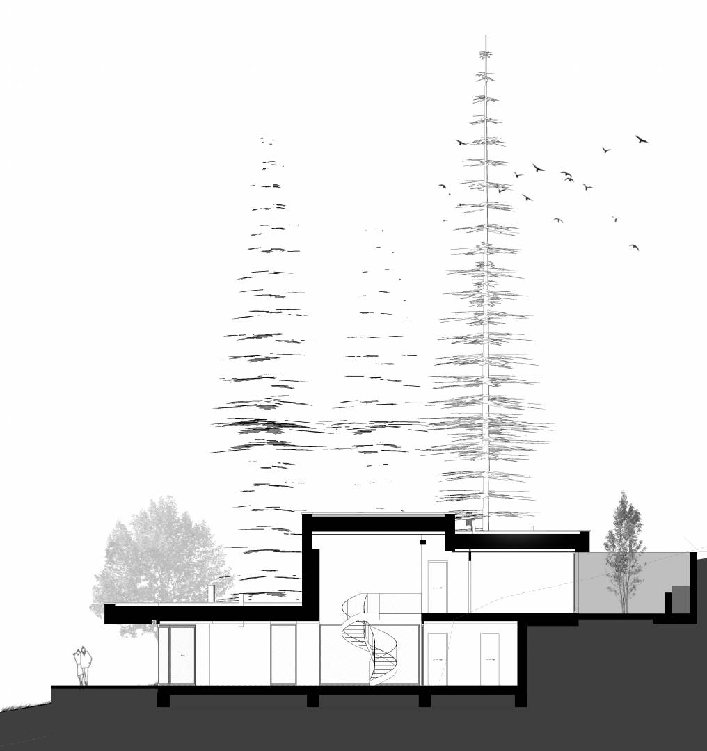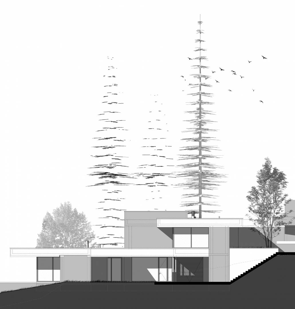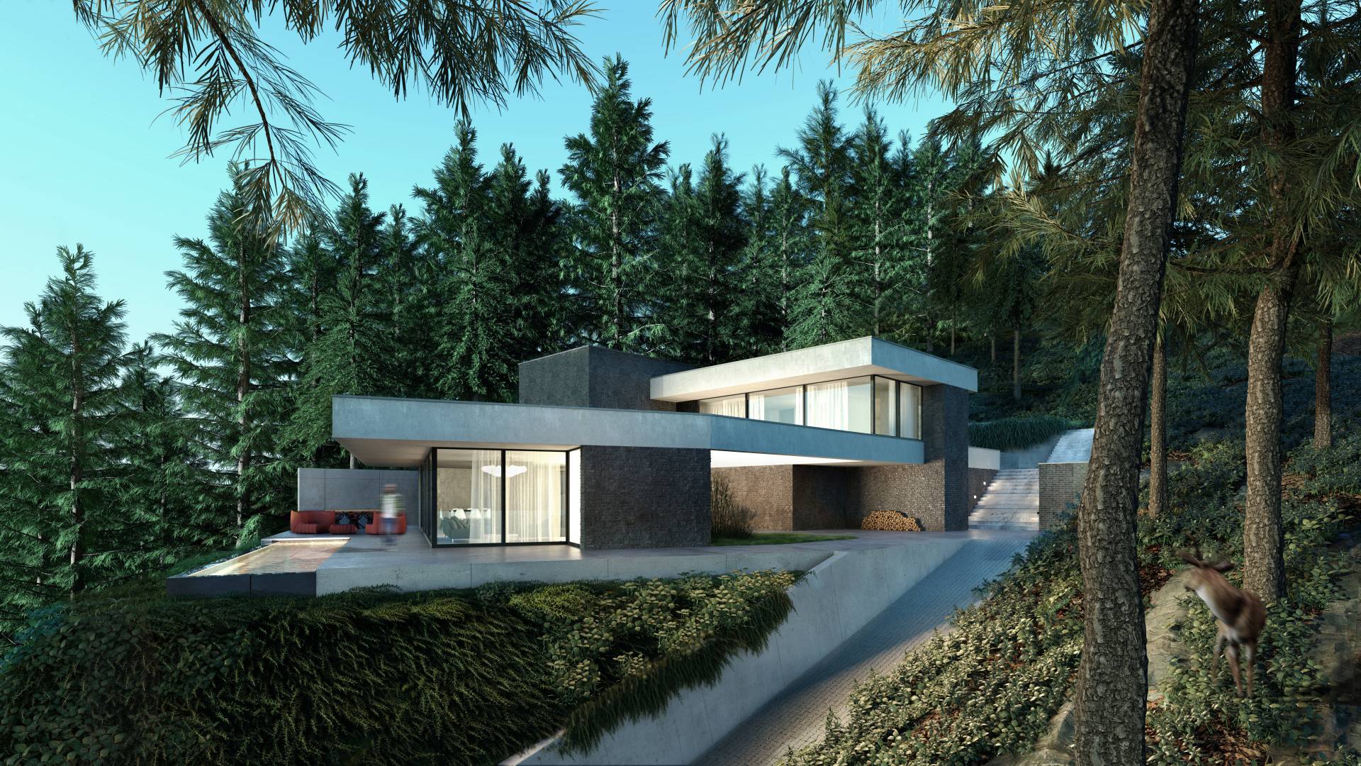 Földszinten kaptak helyet a közösségi területek, és a feszített víztükrű medence, napozóterasz. Tömegében visszahúzva pedig az emeleten találhatók a hálószobák, szintén teljes panorámával, valamint kertkapcsolattal a lejtős terepnek köszönhetően.