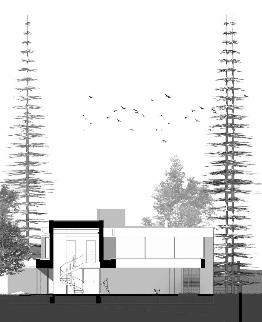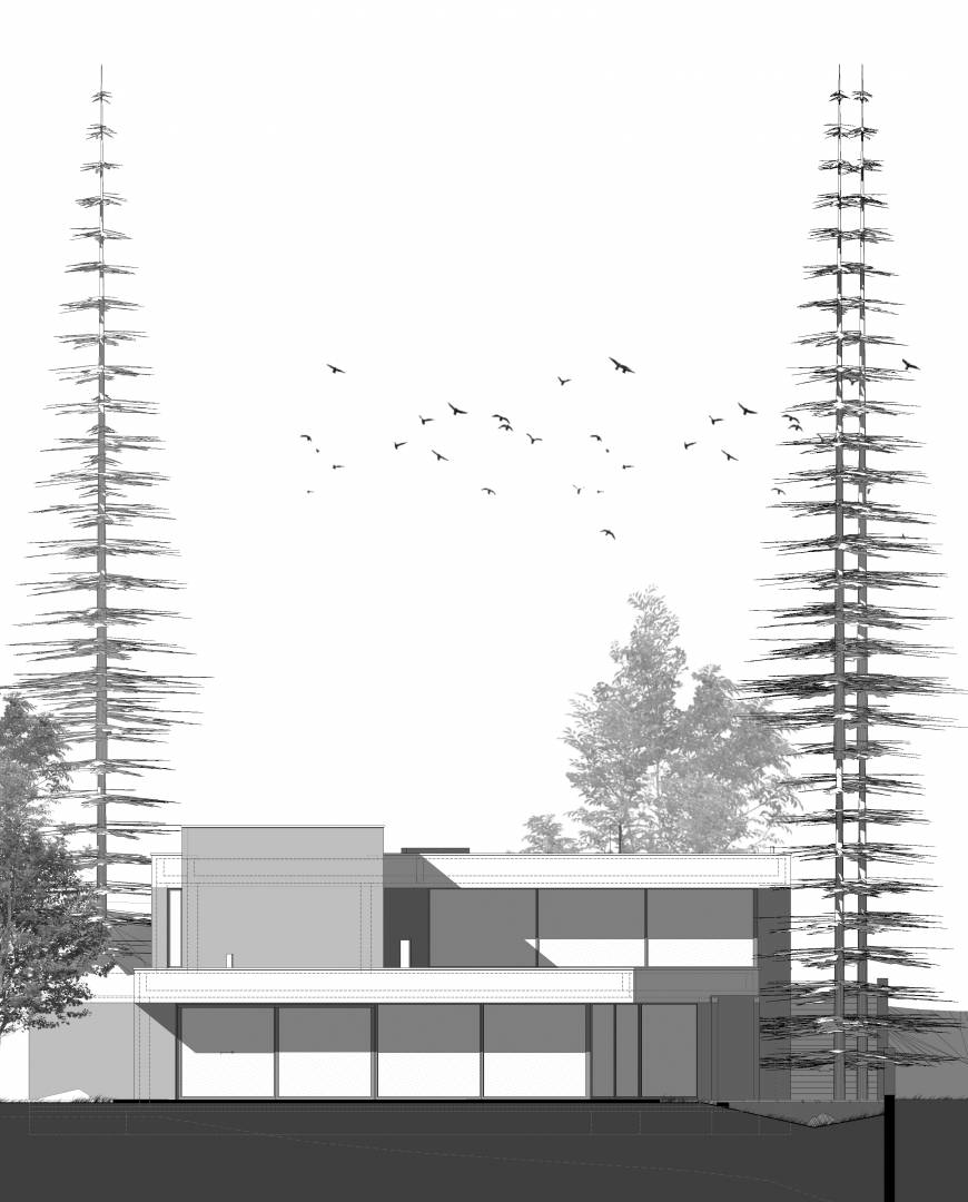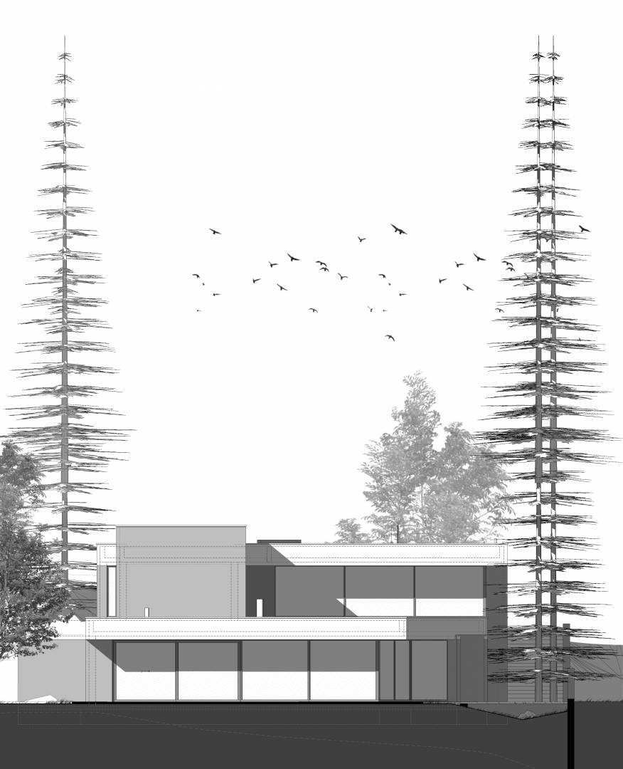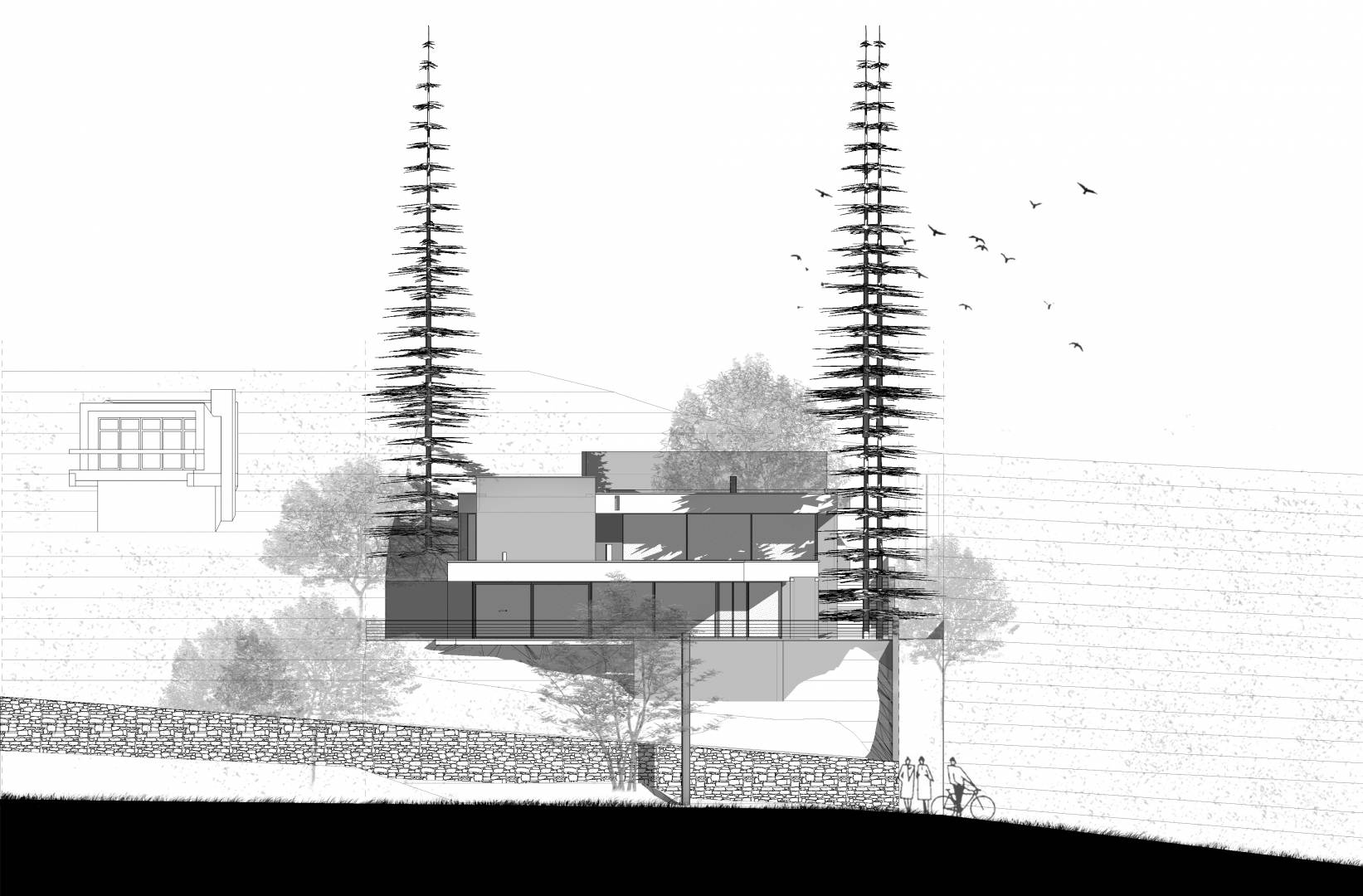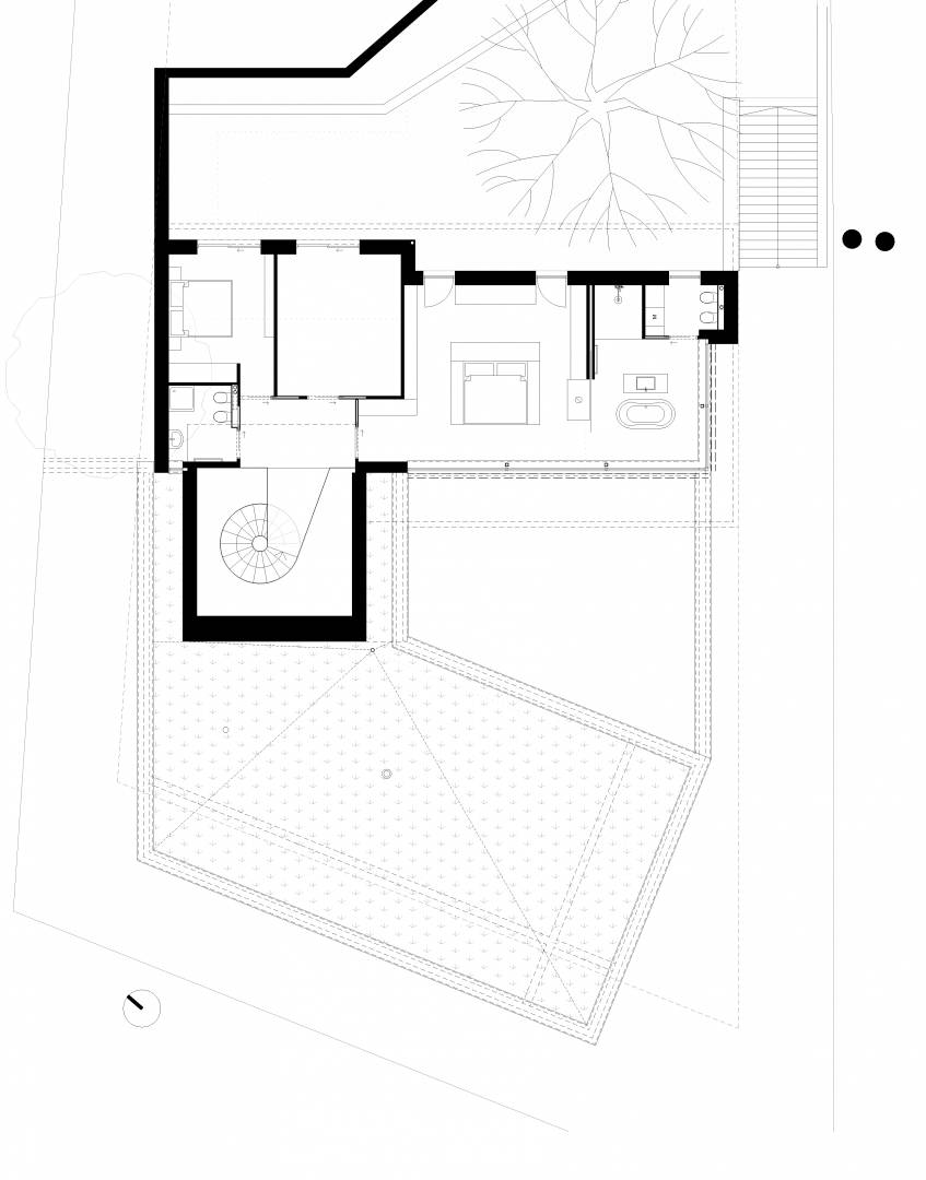 Földszinten kaptak helyet a közösségi területek, és a feszített víztükrű medence, napozóterasz. Tömegében visszahúzva pedig az emeleten találhatók a hálószobák, szintén teljes panorámával, valamint kertkapcsolattal a lejtős terepnek köszönhetően.